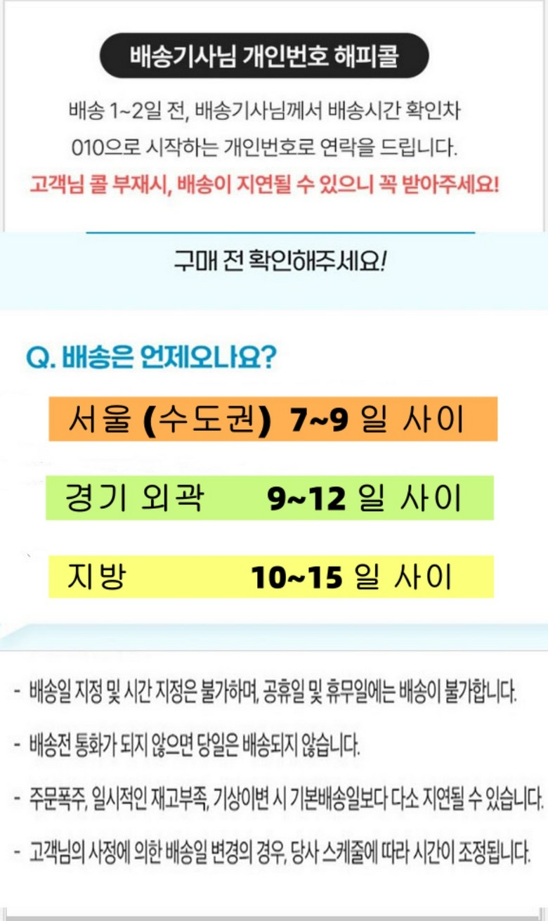 | 배송기간 | ㆍ도서산간 지역 등은 배송에 3-5일이 더 소요될 수 있습니다. - 천재지변, 물량 수급 변동 등 예외적인 사유 발생 시, 다소 지연될 수 있는 점 양해 부탁드립니다. | ||