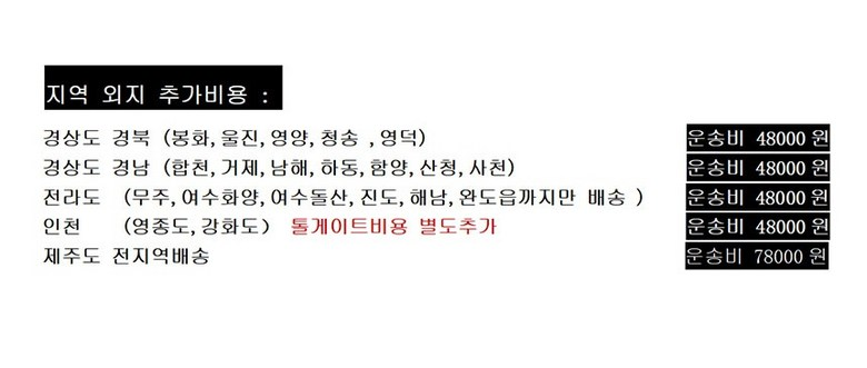 | 배송방법 | 업체직송 | 배송비 | 착불배송(상품별 배송비, 배송가능지역은 상세페이지 참조) - 도서산간 지역 배송불가 |
