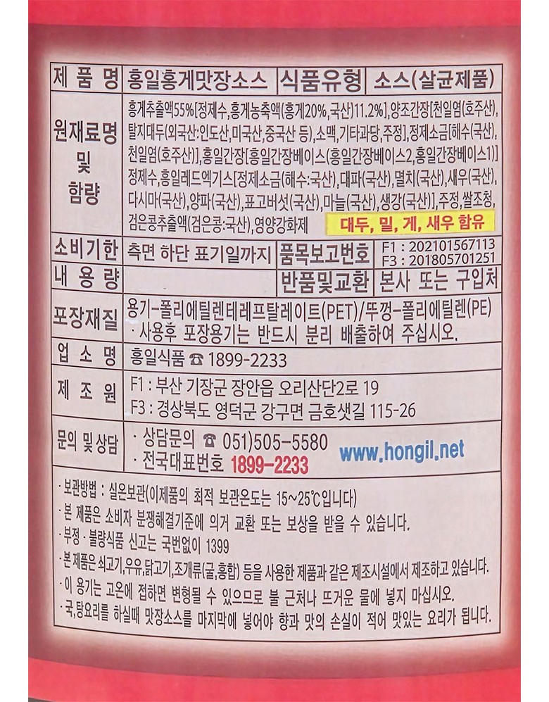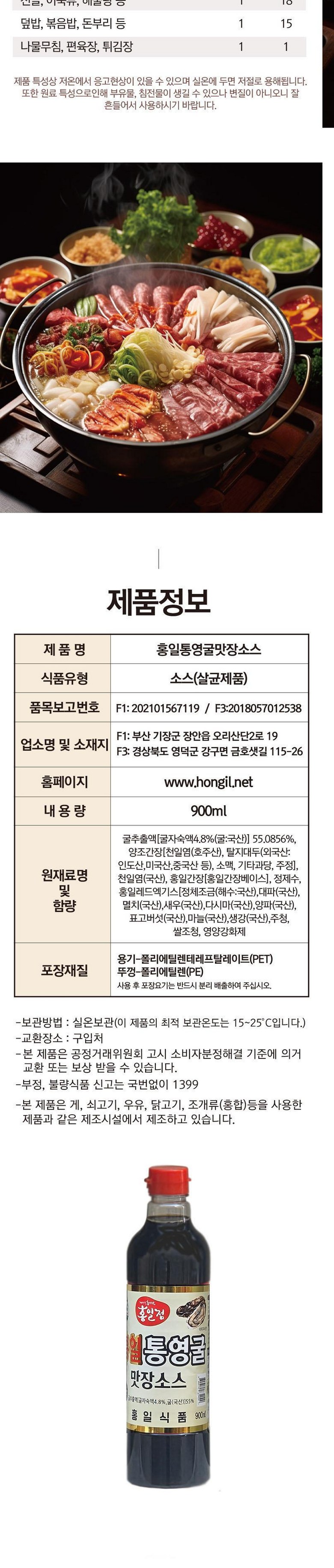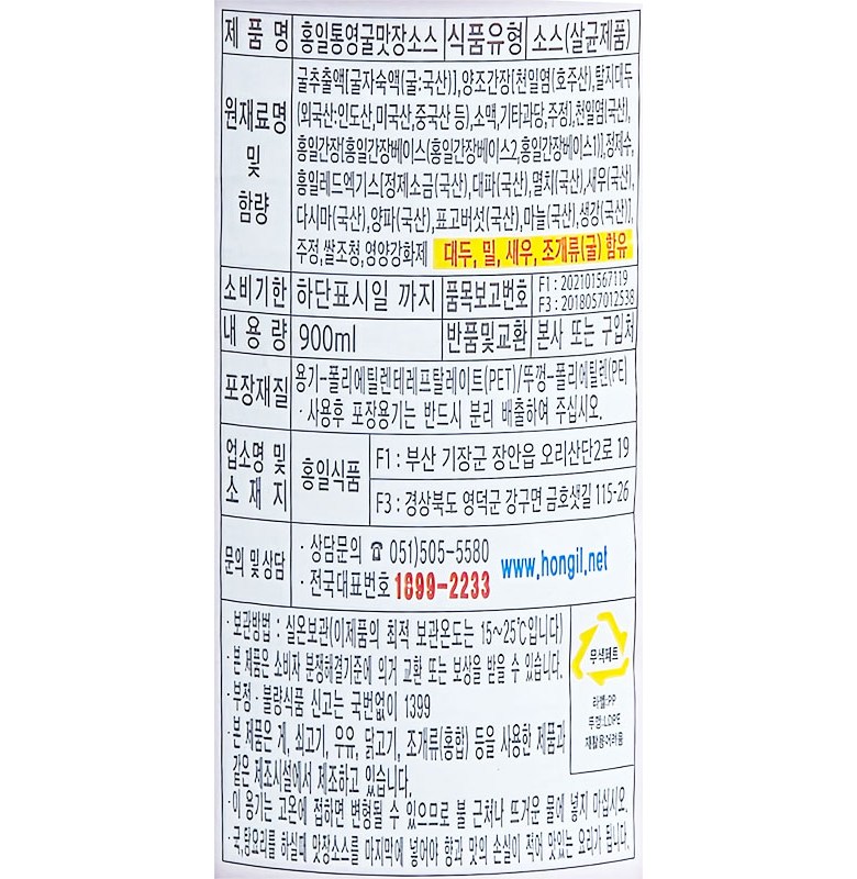 | 제품명 | 홍일 통영굴맛장소스 | 식품의 유형 | 소스류 |