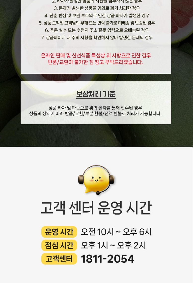 | 계절상품/식품/화장품 | ㆍ신선/냉장/냉동 상품의 단순변심의 경우 ㆍ뷰티 상품 이용 시 트러블(알러지, 붉은 반점, 가려움, 따가움)이 발생하는 경우, |