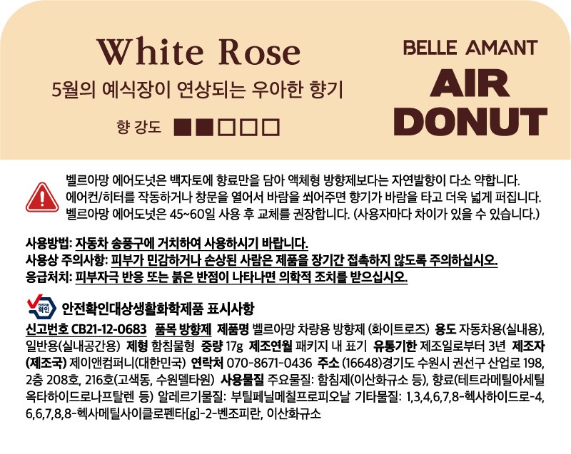 | 품목 및 제품명 | 방향제 / 벨르아망 차량용 방향제 (화이트로즈) | 용도(표백제의 경우 계열을 함께표시) 및 제형 | 일반용 (실내공간용),자동차용 (실내용) / 함침물형 |