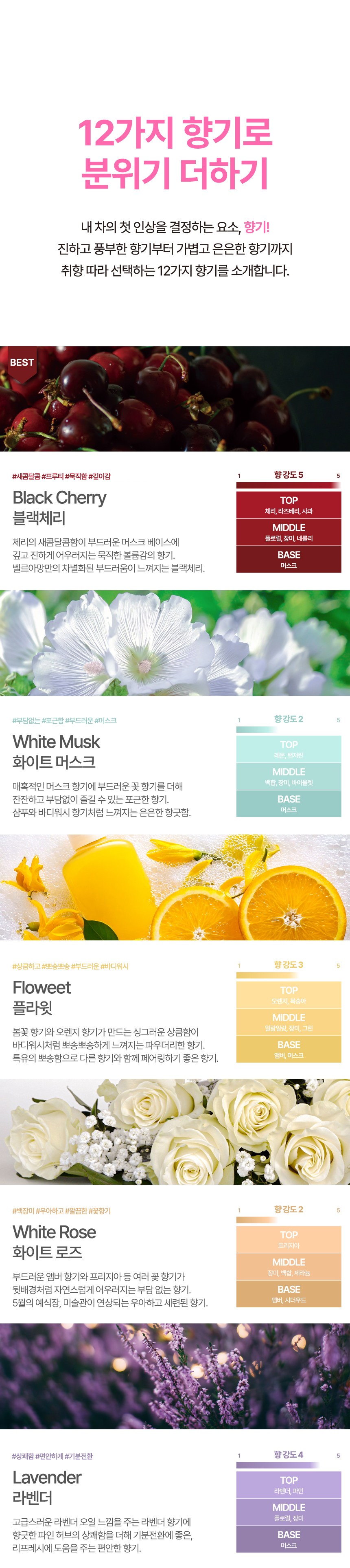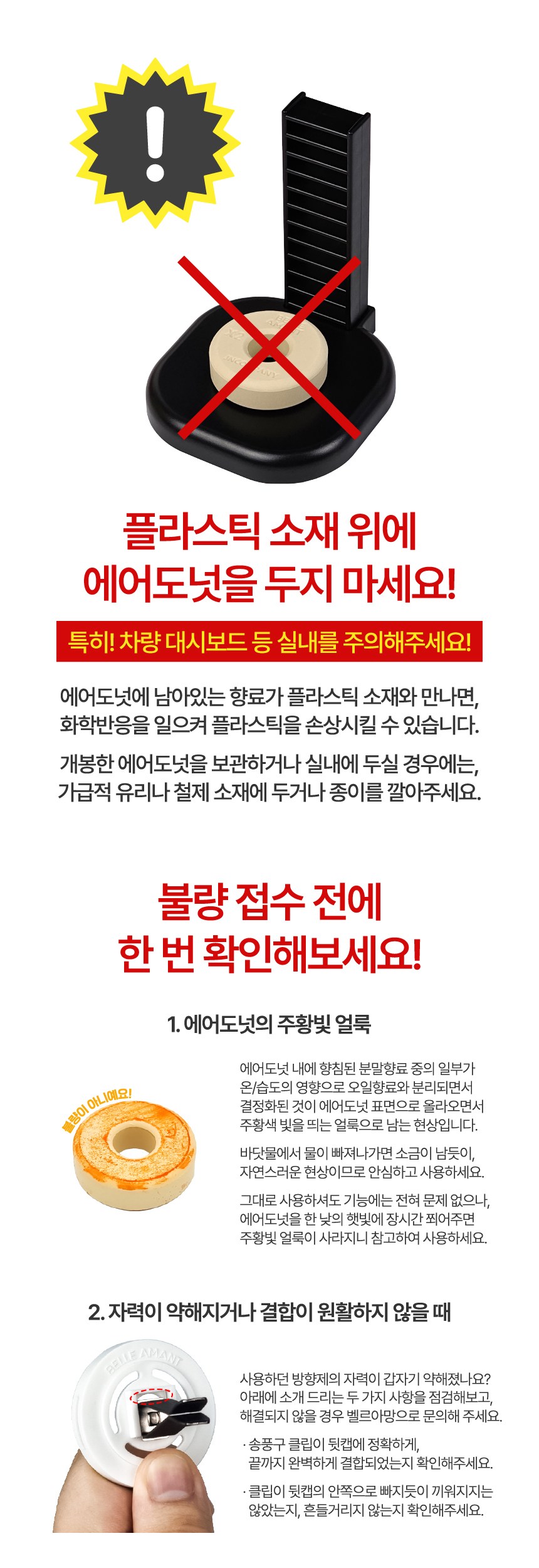 | 품목 및 제품명 | 방향제 / 벨르아망 차량용 방향제 (화이트자스민민트) | 용도(표백제의 경우 계열을 함께표시) 및 제형 | 일반용 (실내공간용),자동차용 (실내용) / 함침물형 |