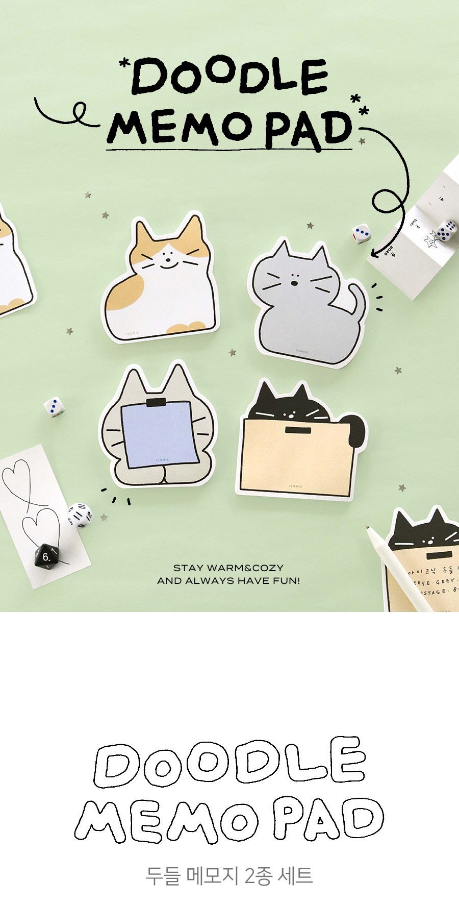 | 품명 및 모델명 | 아이코닉 두들 메모지 세트 다꾸 떡메 메모패드 떡메모지 04 Box 1세트 2개입 | 인증/허가 사항 | 해당없음(14세이상) |