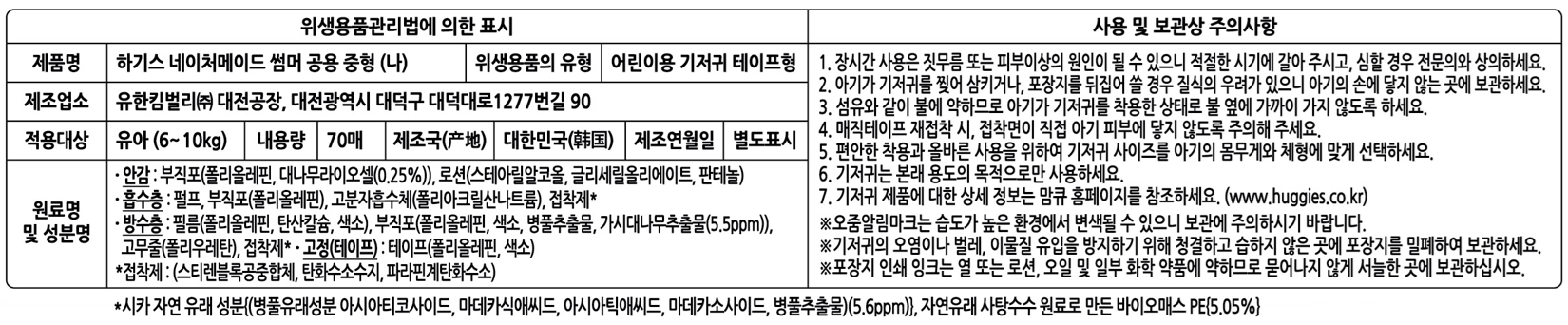 | 품명 및 모델명 | 하기스 네이처메이드 썸머 공용 중형 (나) | 인증/허가 사항 | 위생용품 |