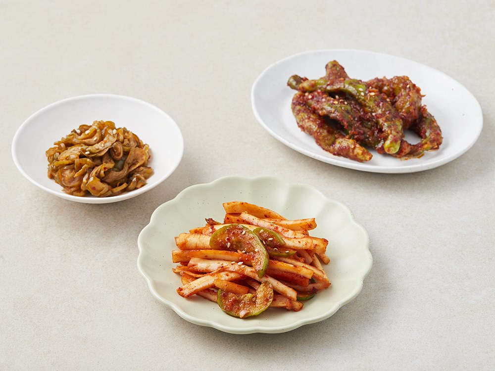 오이도라지초무침, 꽈리고추무침, 오이지무침으로 구성되어 있습니다.