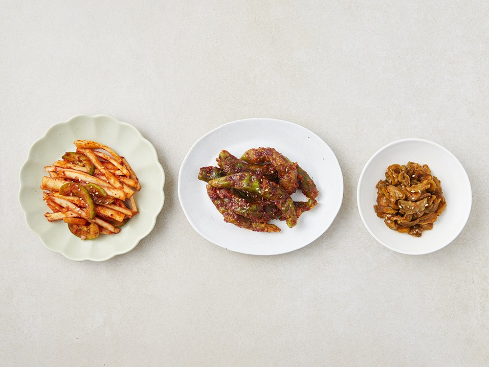 식탁에 바로 올려 즐기는 반찬 세트예요. 매콤하면서 새콤한 세 가지 반찬으로 구성되어 다채롭게 드실 수 있죠. 산뜻한 풍미가 매력인 오이도라지초무침, 아삭아삭한 꽈리고추무침, 꼬들꼬들한 오이지무침을 취향껏 골라 따뜻한 밥에 올려보세요. 도시락 반찬으로 간편하게 활용해도 좋아요.