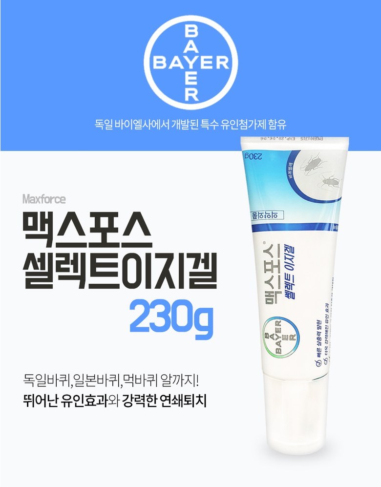 | 효과,효능 (승인대상 제품에 한함) | 바퀴벌레 구제 / 바퀴벌레 구제 | 수입자(수입제품에 한함), 제조국 및 제조사 | 바이엘크롭사이언스 / 프랑스 / 바이엘크롭사이언스 |