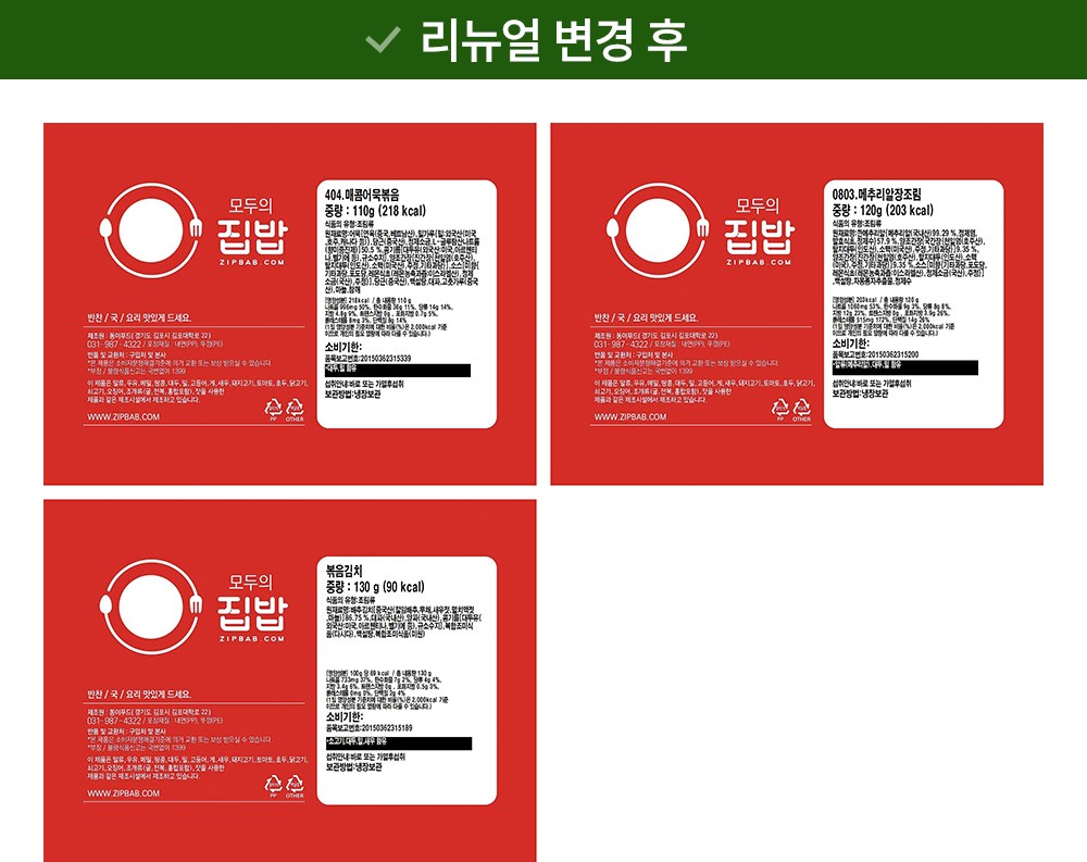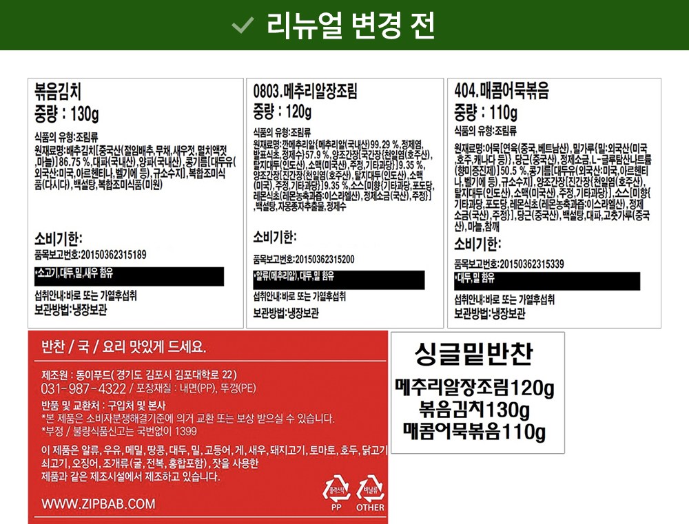 | 제품명 | 볶음김치, 메추리알장조림, 매콤어묵볶음 | 식품의 유형 | 컨텐츠 참조 |