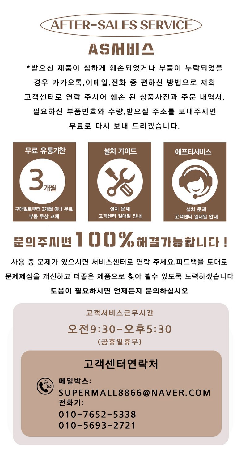 | 소비자상담 관련 전화번호 | 전화번호 010-7652-5338 010-5693-2721 메일주소 supermall8866@naver.com | ||
