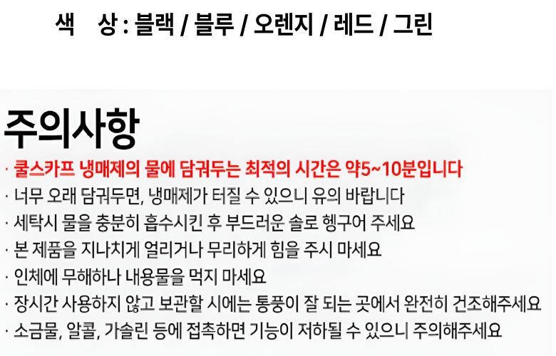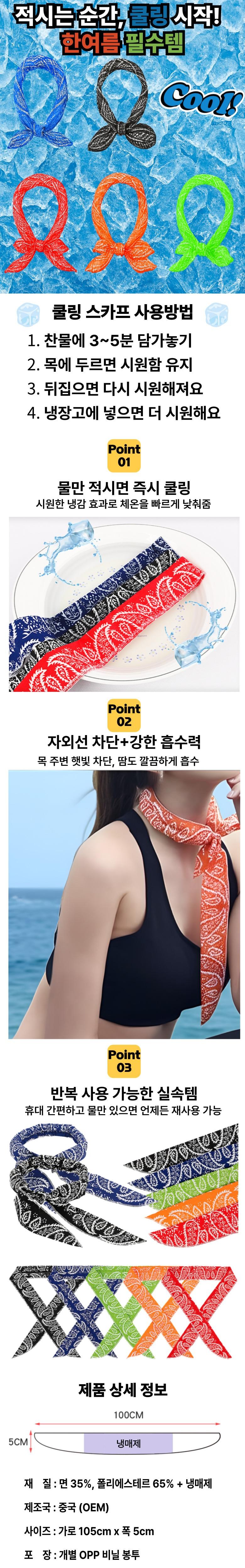 | 종류 | 쿨 스카프 | 소재 | 면35% 폴리에스테르65% + 냉매제 |