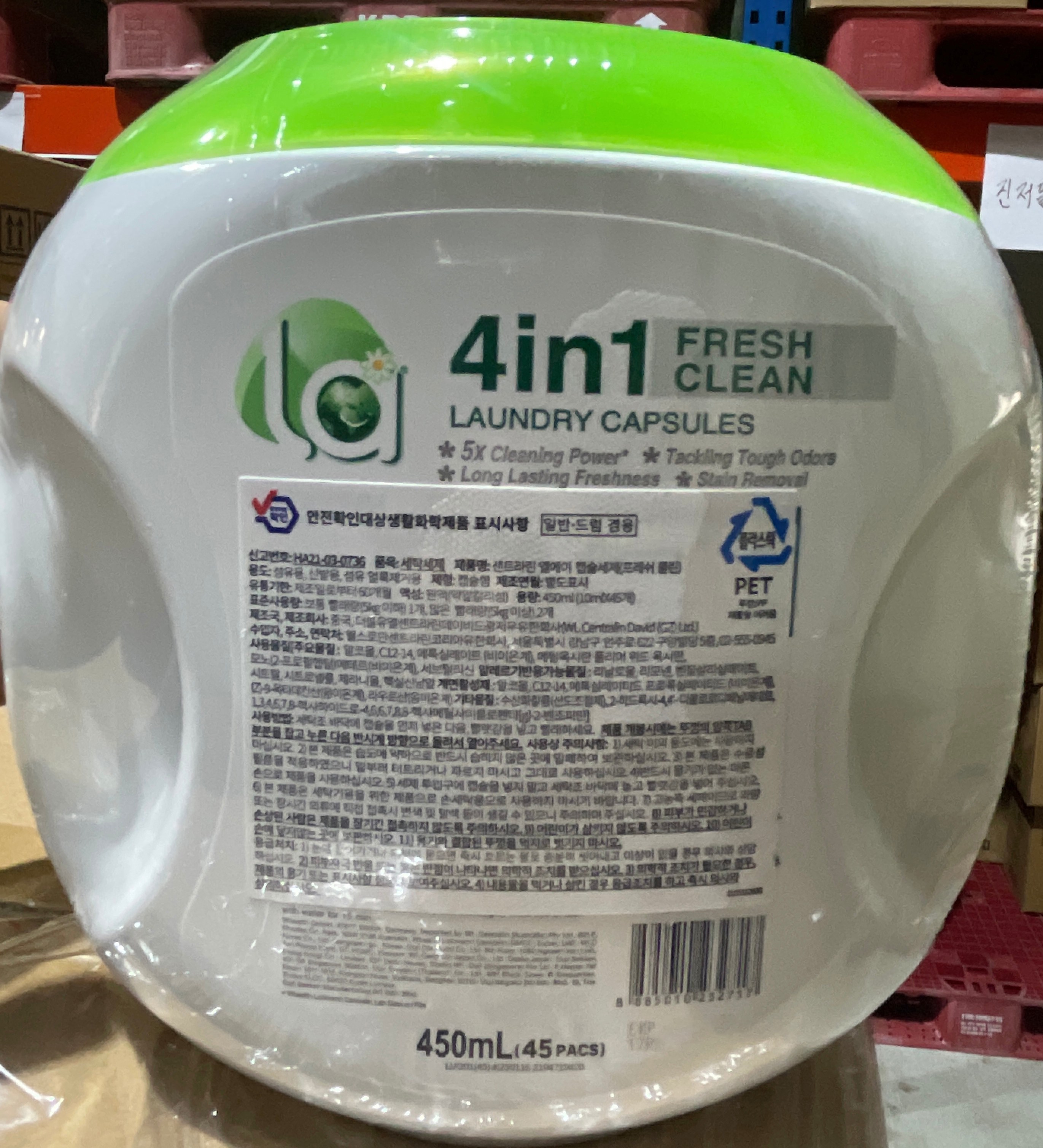 | 품목 및 제품명 | 세탁세제 / 센트라린 엘에이 캡슐세제(프레쉬 클린) | 용도(표백제의 경우 계열을 함께표시) 및 제형 | 섬유 얼룩제거용, 섬유용, 신발용 / 캡슐형 |