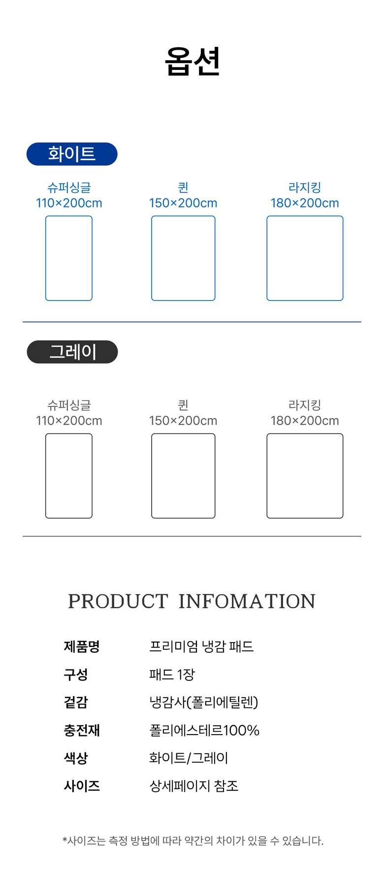 | 치수 | 예) 이불 : 400x2000mm / 패드 : 400x2200mm (mm, cm 단위로 기재해주세요) | 제품구성 | 예) 이불 + 패드 |