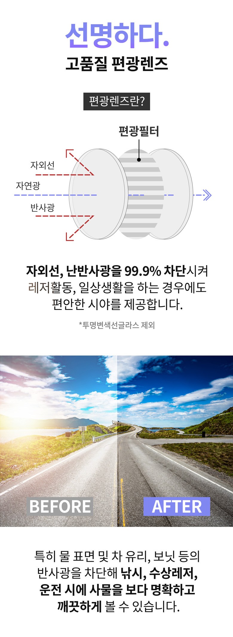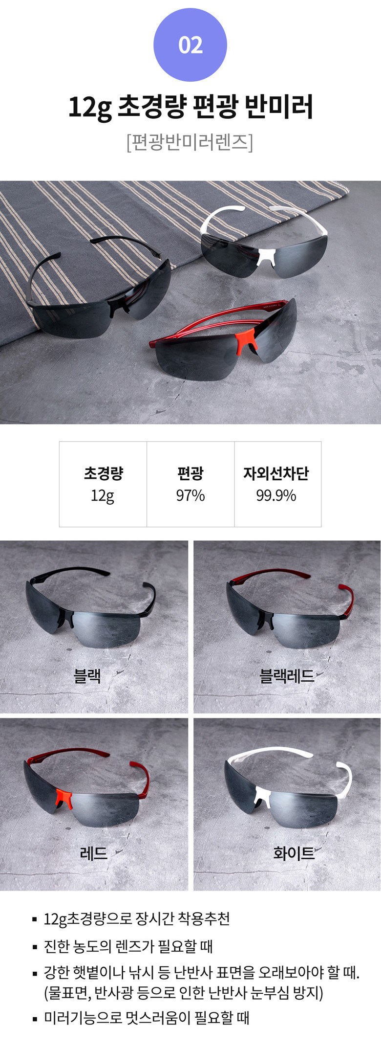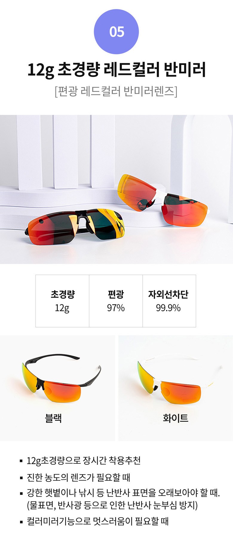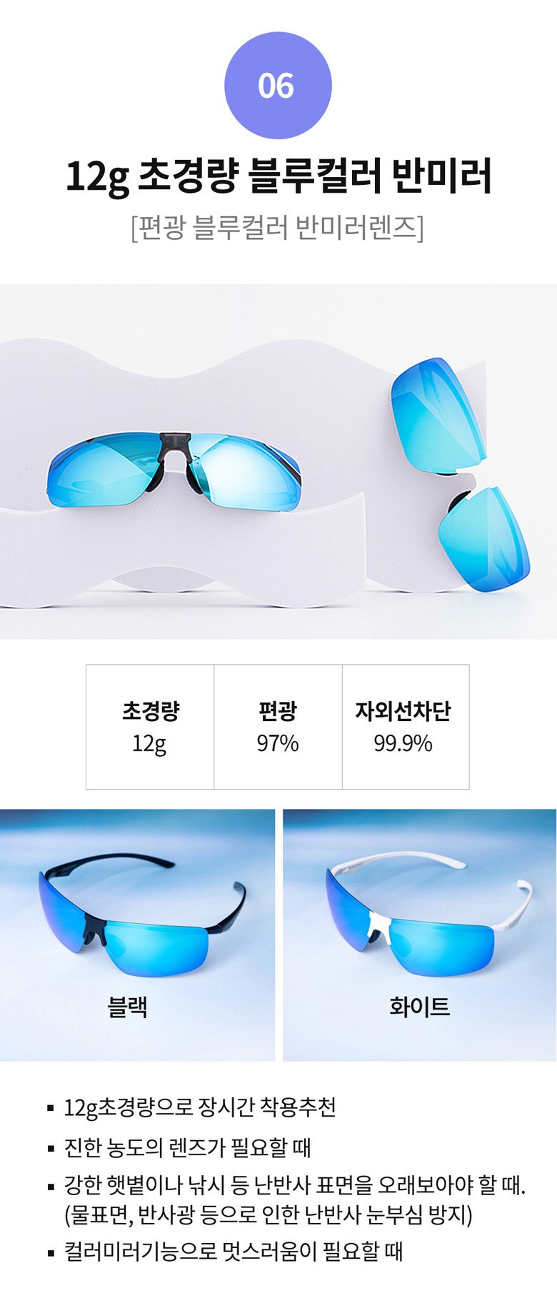 - 렌즈 종류: 편광렌즈(반사되는 빛을 차단)
