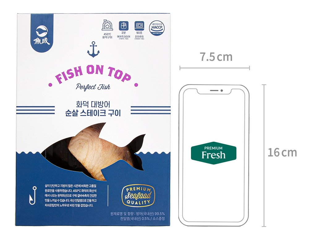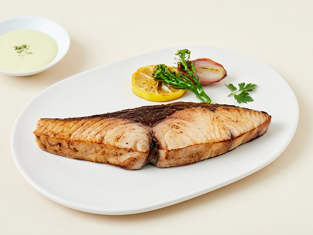 국내 바다에서 잡은 대방어를 사용한 스테이크입니다. 지방이 통통하게 오른 시기에 어획한 방어만 엄선해 고소한 맛이 일품이고요. 두꺼운 가시와 비늘을 손질한 뒤, 국산 천일염으로 염지까지 마쳤기에 간편하게 즐길 수 있답니다. 450 ℃ 화덕에서 구워 깊은 풍미도 살아있으니 에어프라이어에 간단히 조리해 근사한 레스토랑에서 맛보던 대방어 스테이크의 맛을 즐겨보세요.