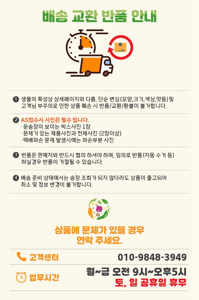 - ㆍ모니터 해상도의 차이로 인해 색상이나 이미지가 실제와 달라, 고객이 단순 변심으로 교환/반품을 무료로 요청하는 경우