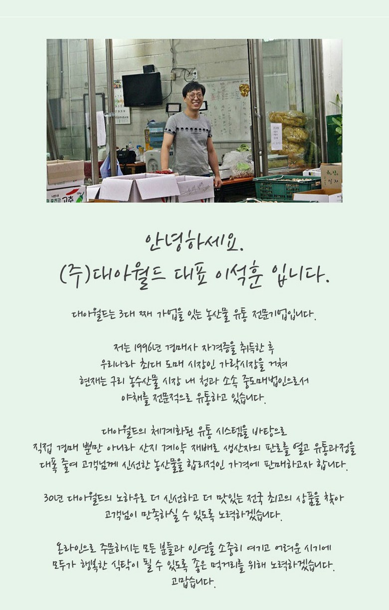 상호/대표자 | (주)대아월드 / 이석훈 | 사업장 소재지 | 경기도 구리시 동구릉로136번길 90 청과동 330호 (인창동) |