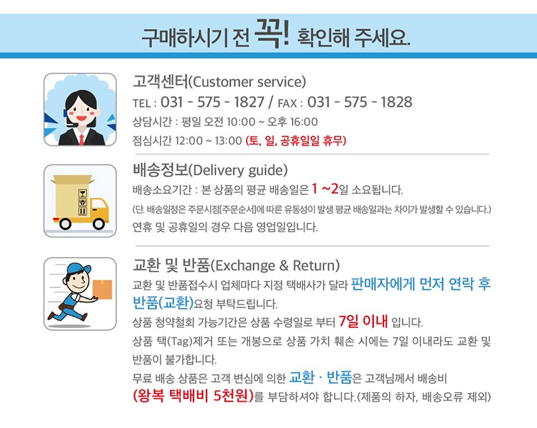 - ㆍ모니터 해상도의 차이로 인해 색상이나 이미지가 실제와 달라, 고객이 단순 변심으로 교환/반품을 무료로 요청하는 경우