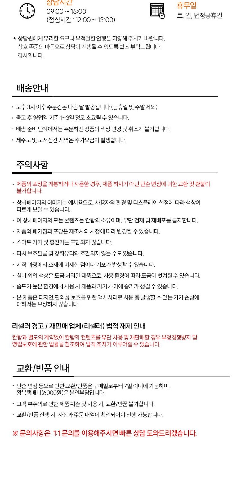 - ㆍ교환/반품에 관한 일반적인 사항은 판매자가 제시사항보다 관계법령이 우선합니다.