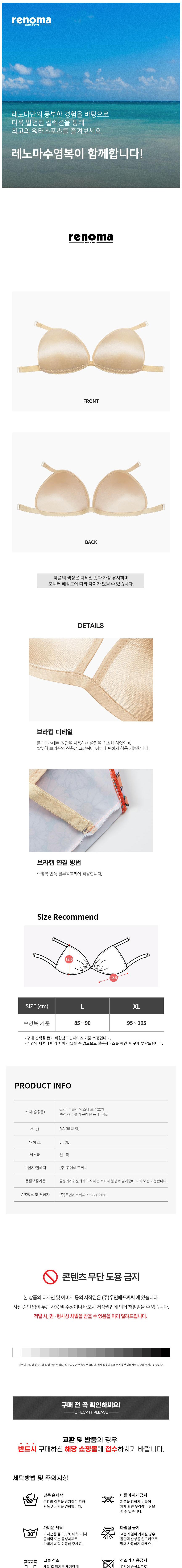 | 품명 및 모델명 | [레노마수영복] 여성 탈부착 브라컵 RO-RP2D006 BG L | KC 인증정보 | 해당없음 |