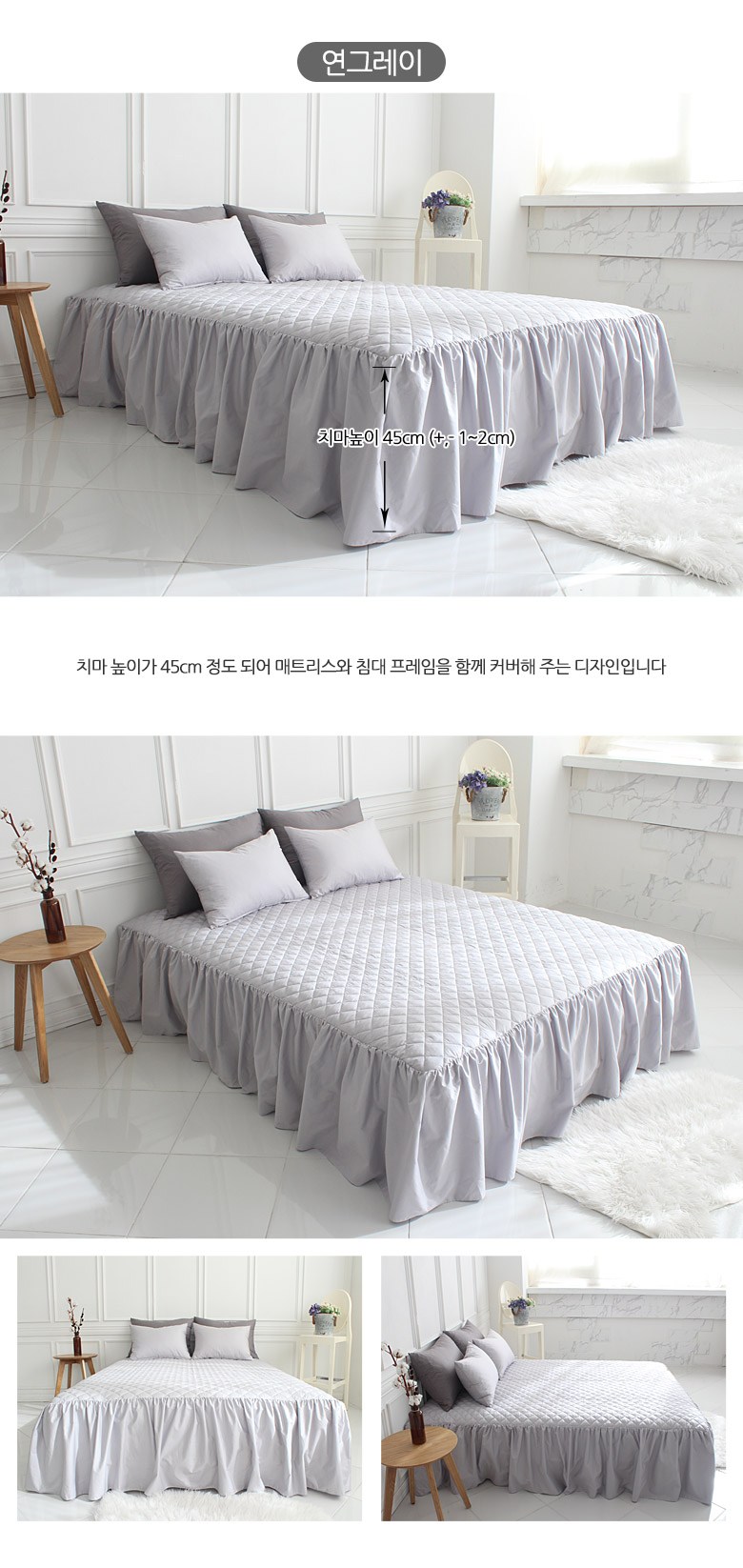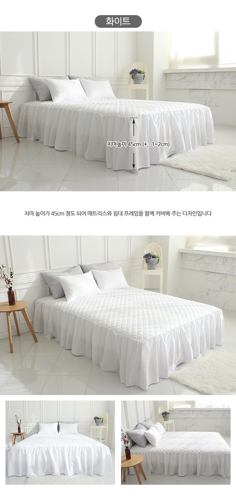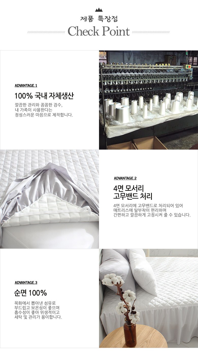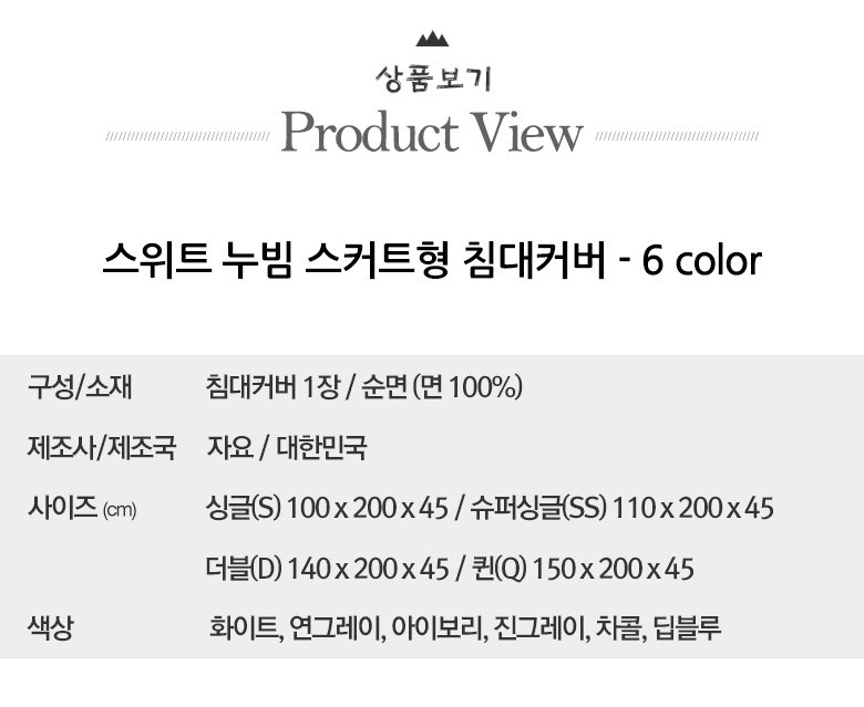 | 치수 | 싱글(S):100x200x45 cm, 슈퍼싱글(SS):110x200x45 cm,더블(D):140x200x45 cm, 퀸(Q):150x200x45 cm (오차범위:+/- 1~2 cm) | 제품구성 | 누빔 스커트형 침대커버 1장 |