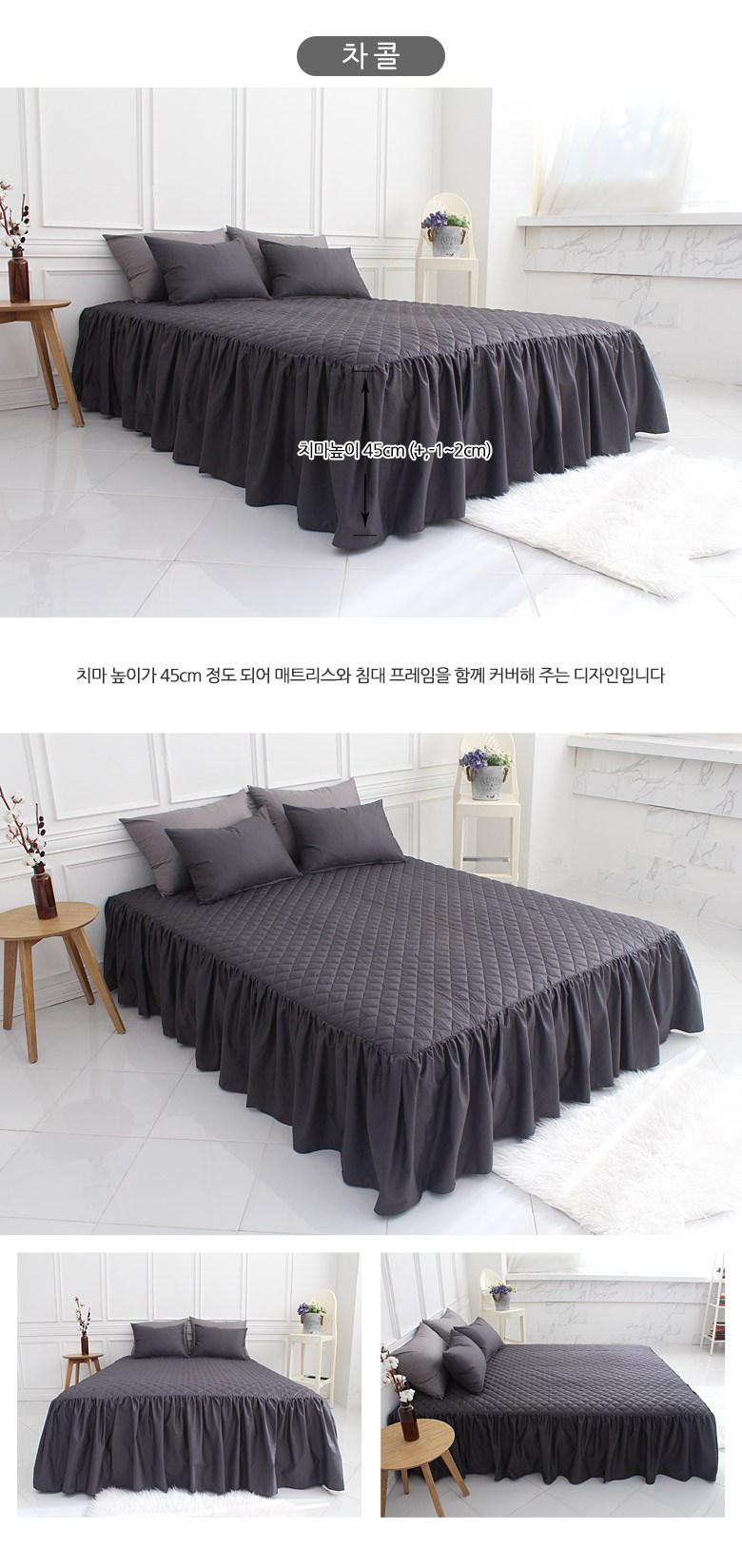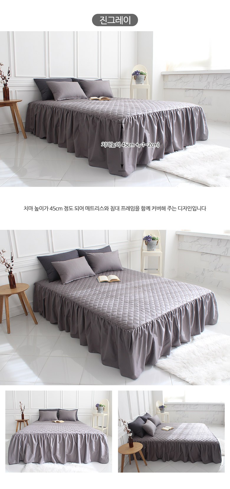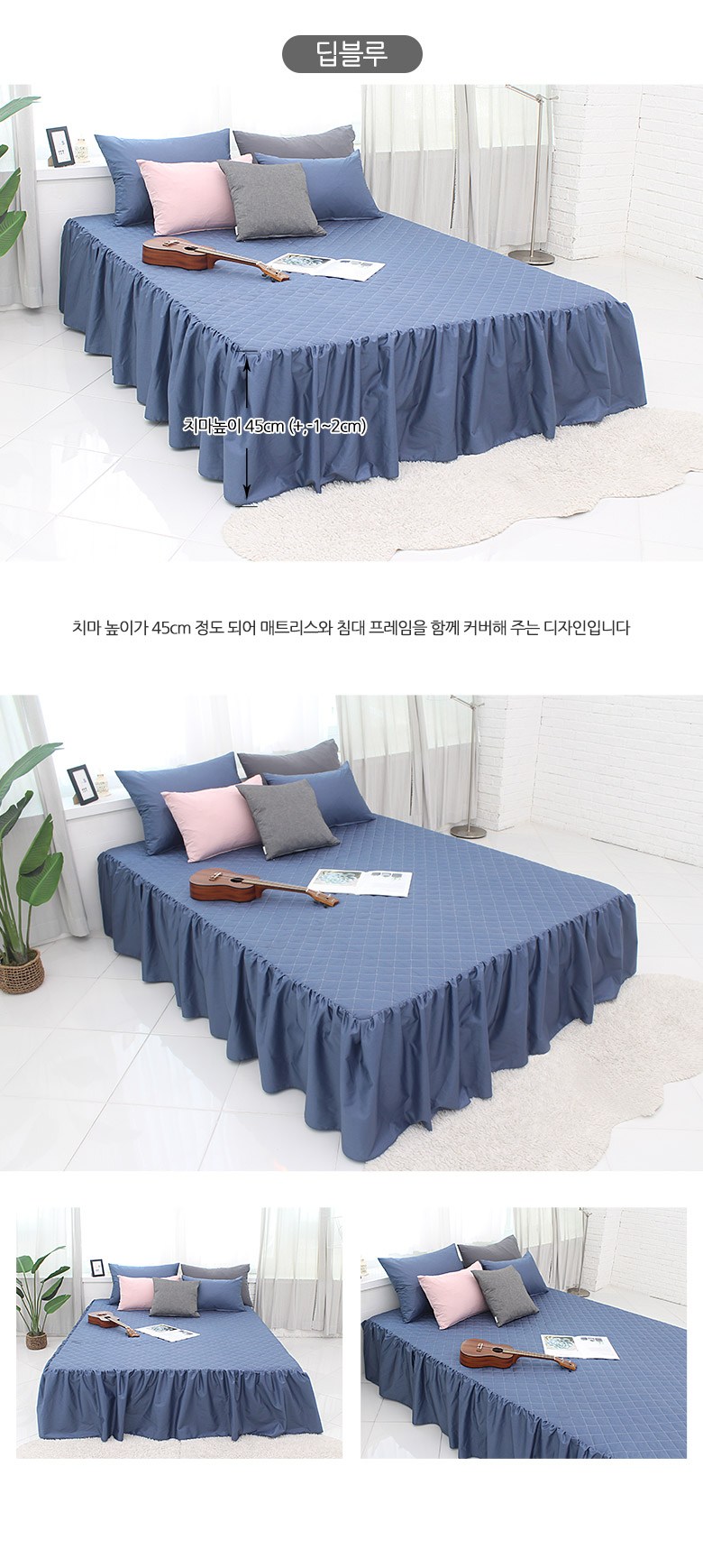 | 치수 | 싱글(S):100x200x45 cm, 슈퍼싱글(SS):110x200x45 cm,더블(D):140x200x45 cm, 퀸(Q):150x200x45 cm (오차범위:+/- 1~2 cm) | 제품구성 | 누빔 스커트형 침대커버 1장 |