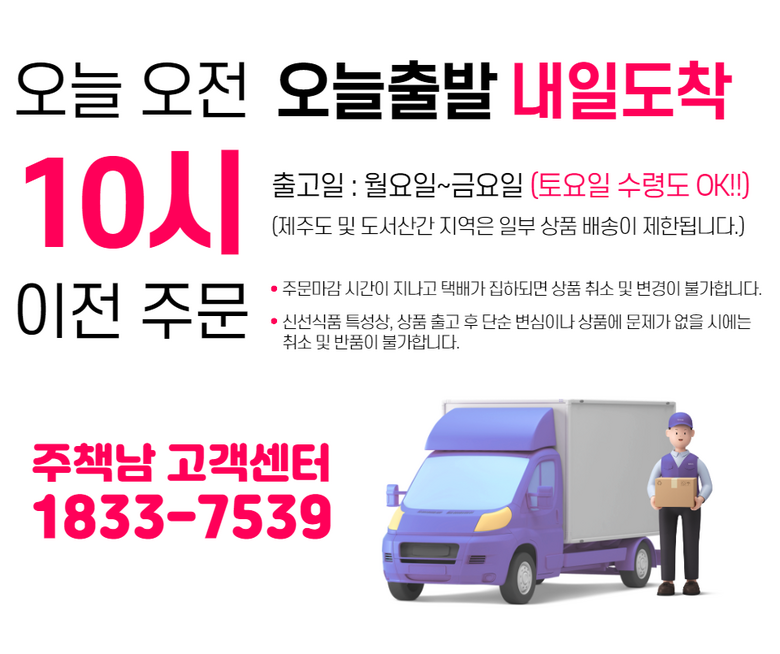 | 배송방법 | 신선/냉장/냉동 | 배송비 | 무료배송 - 도서산간 지역 배송불가 |