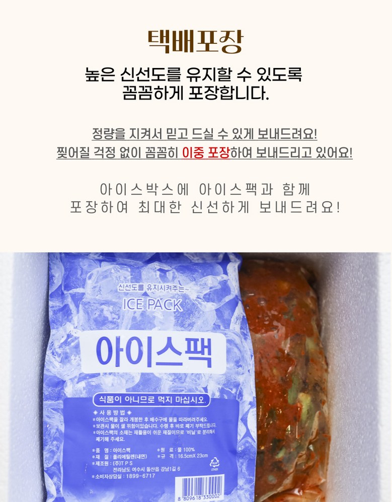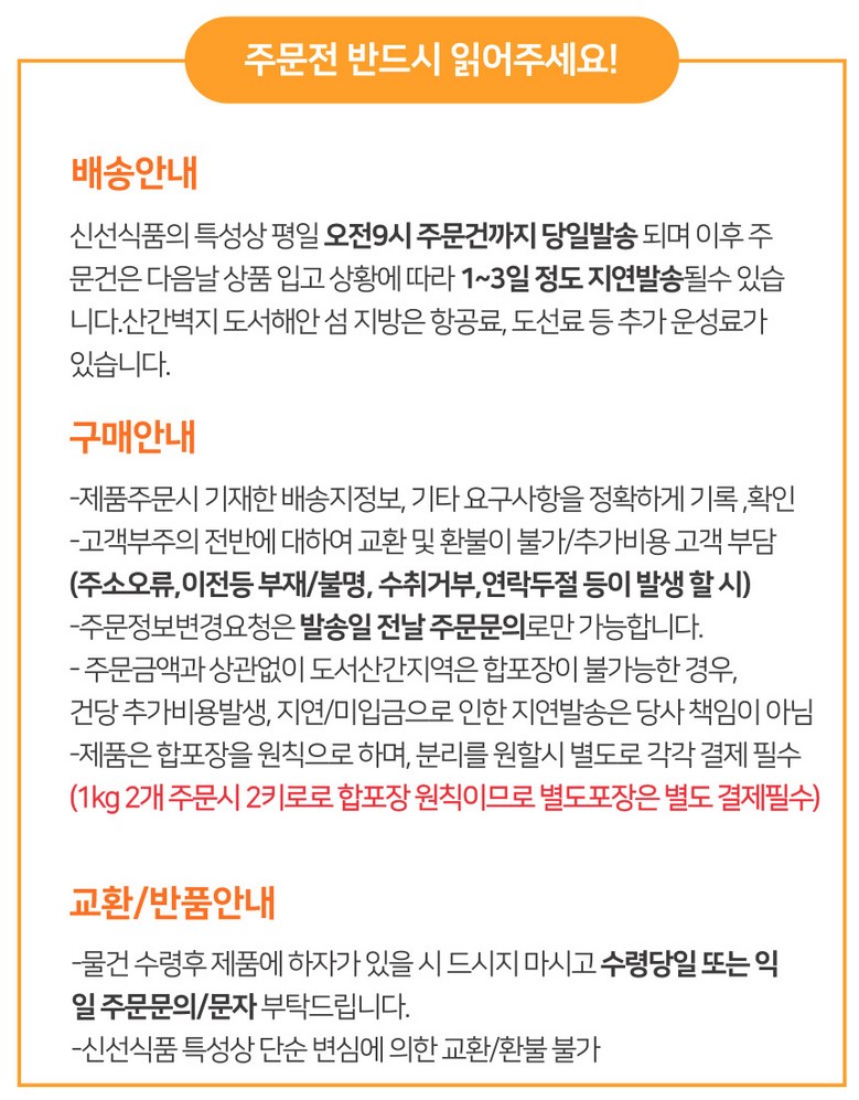 | 배송방법 | 신선/냉장/냉동 | 배송비 | 무료배송 · 도서산간 추가 배송비 - 제주 지역: 5,000원 - 도서산간 지역: 5,000원 |