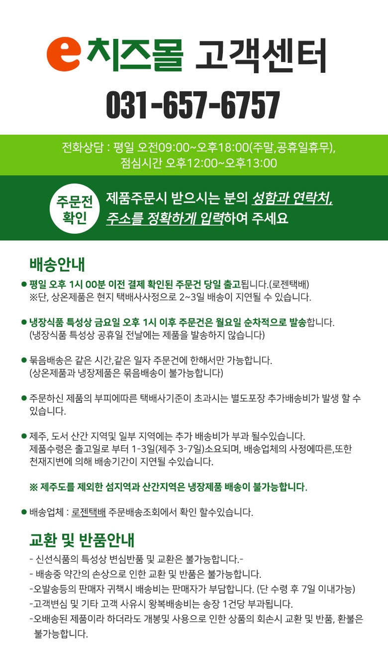 상호/대표자 | (e)치즈몰(서울우유치즈고객센터) / 김영이 | 사업장 소재지 | 경기도 안성시 원곡면 방삼길 15-14 서울우유치즈안성고객센터 |