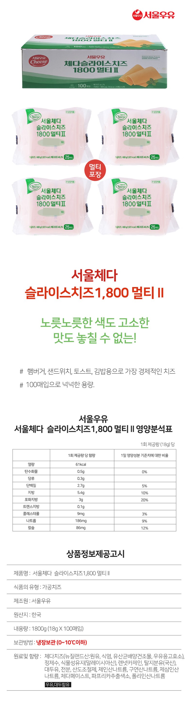 | 제품명 | 서울우유 체다슬라이스 멀티2 | 식품의 유형 | 상세페이지참조 |