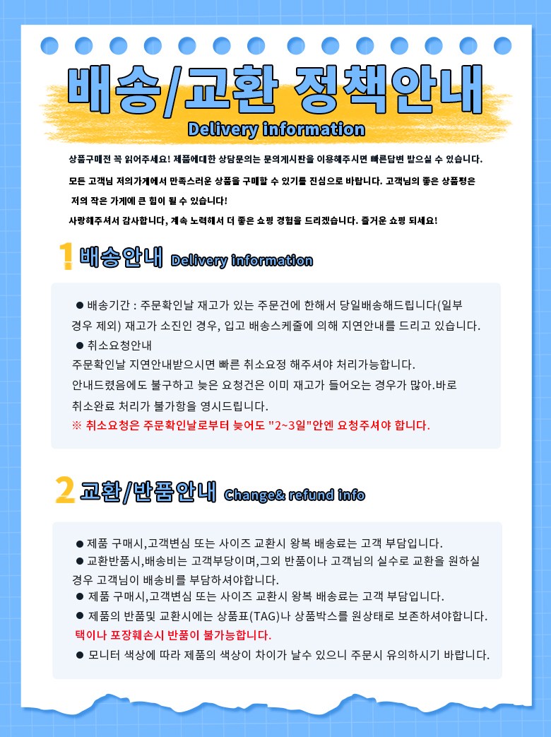 - ㆍ모니터 해상도의 차이로 인해 색상이나 이미지가 실제와 달라, 고객이 단순 변심으로 교환/반품을 무료로 요청하는 경우
