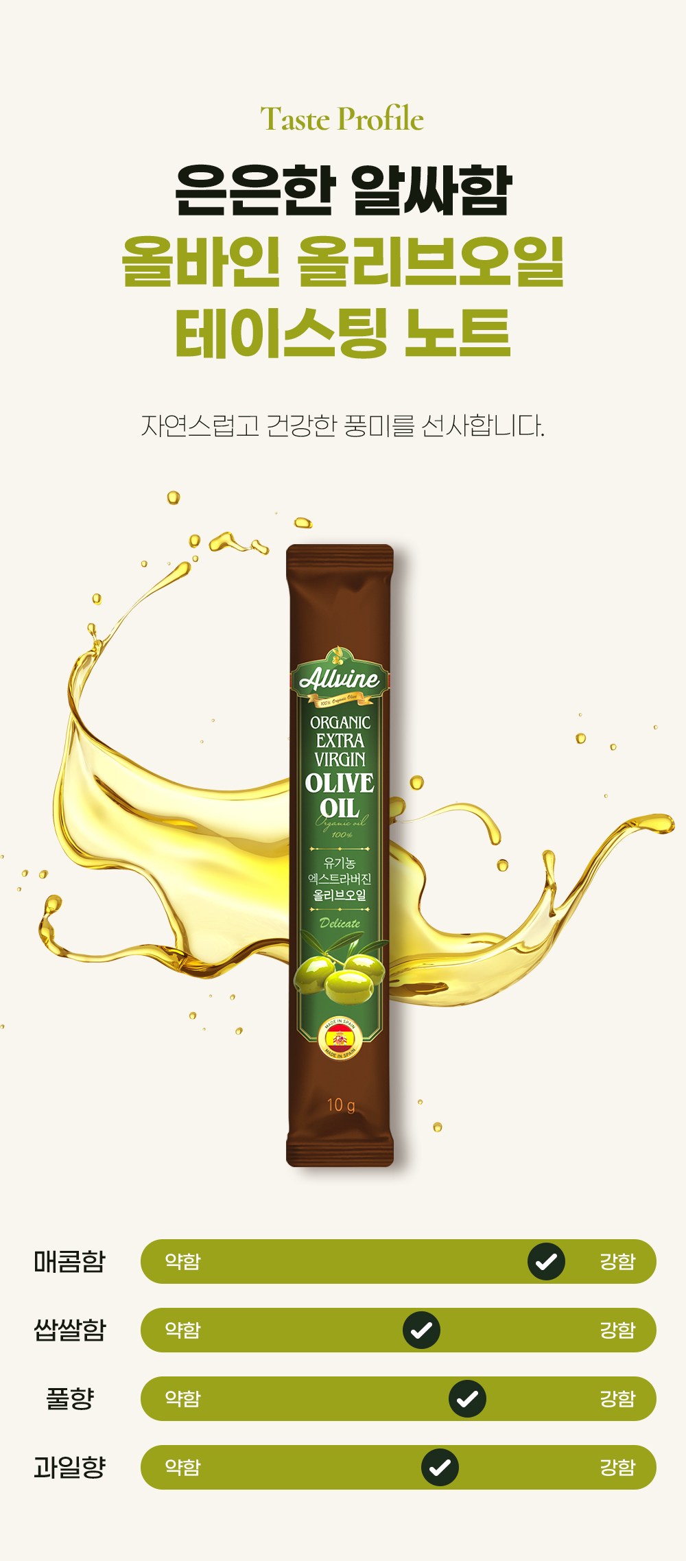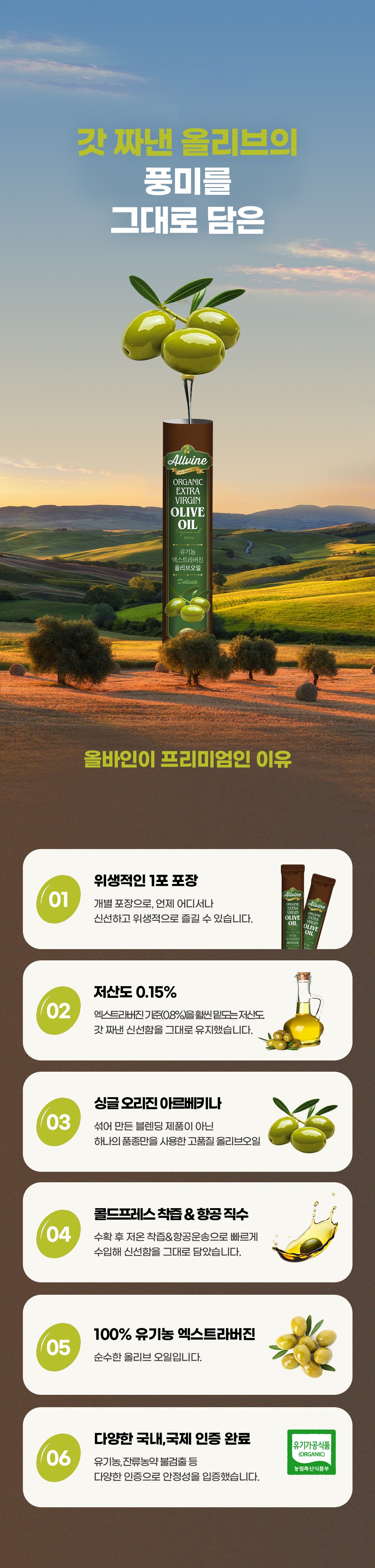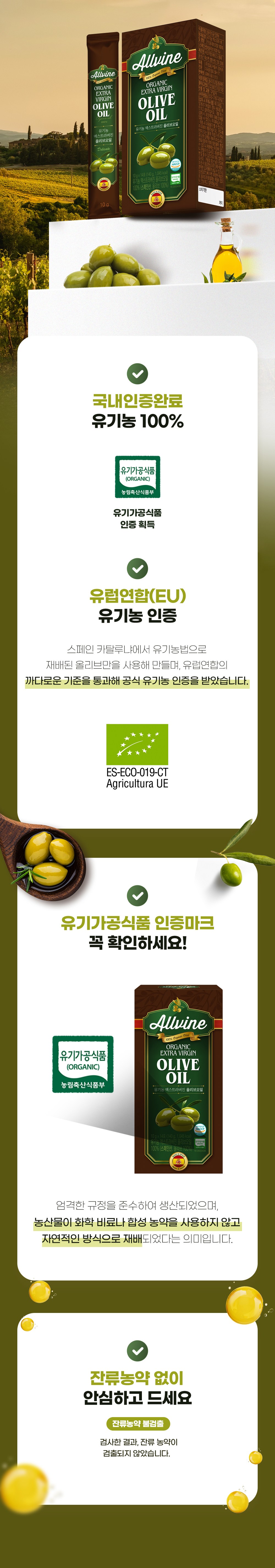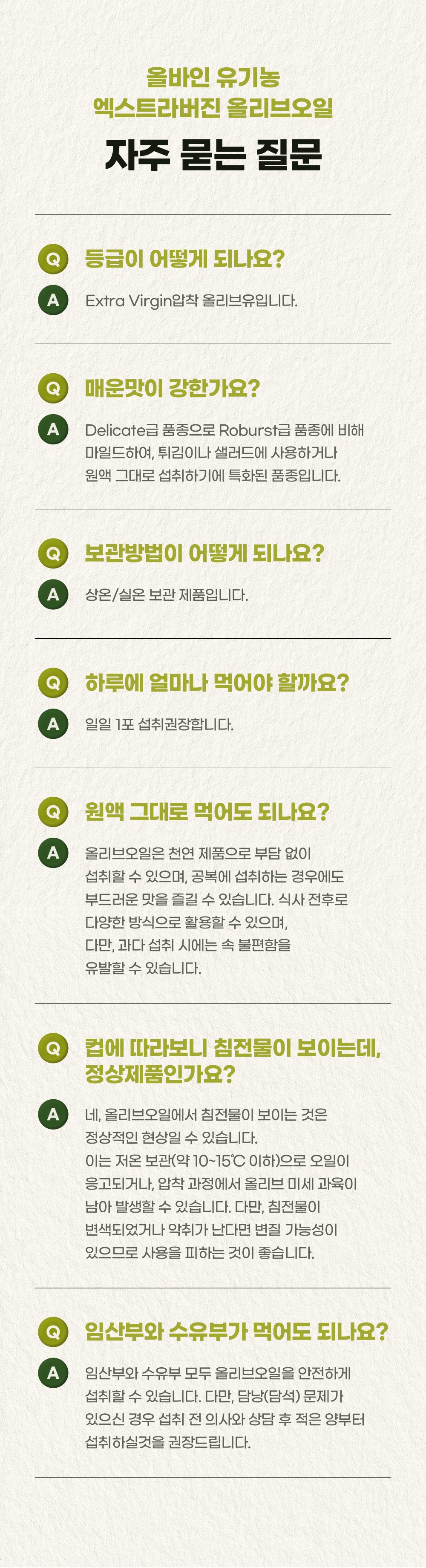| 제품명 | 유기농 엑스트라버진 올리브오일 | 식품의 유형 | 컨텐츠 참조 |
