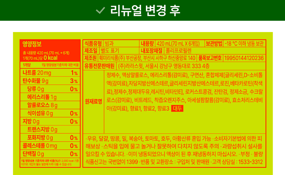 | 생산자 및 소재지 | 컨텐츠 참조 | 제조연월일, 소비기한 또는 품질유지기한 | 제조년월일 : 2025년 08월 19일 이후인 제조상품 |