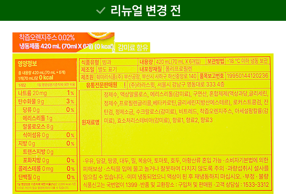 | 제품명 | 라라스윗 오렌지 제로바 | 식품의 유형 | 컨텐츠 참조 |