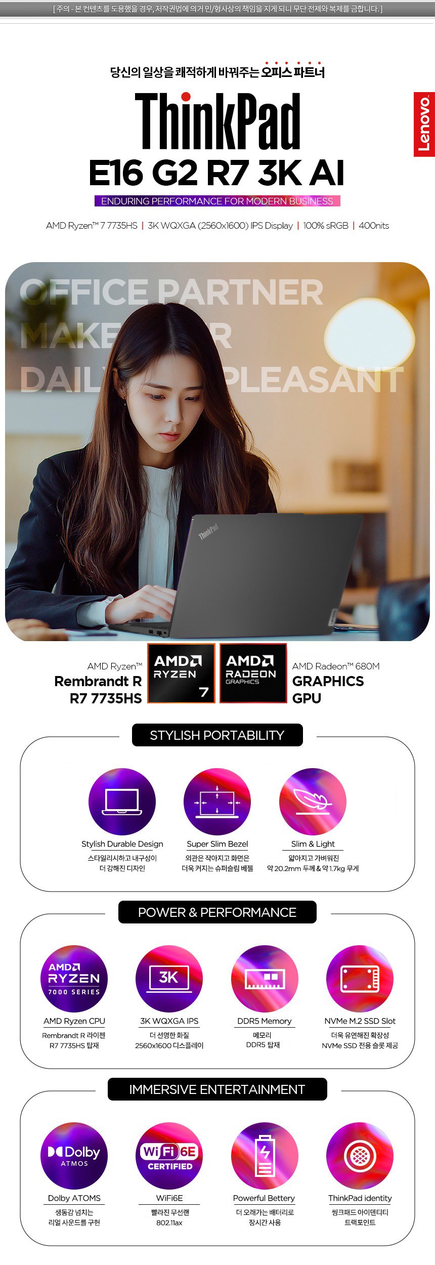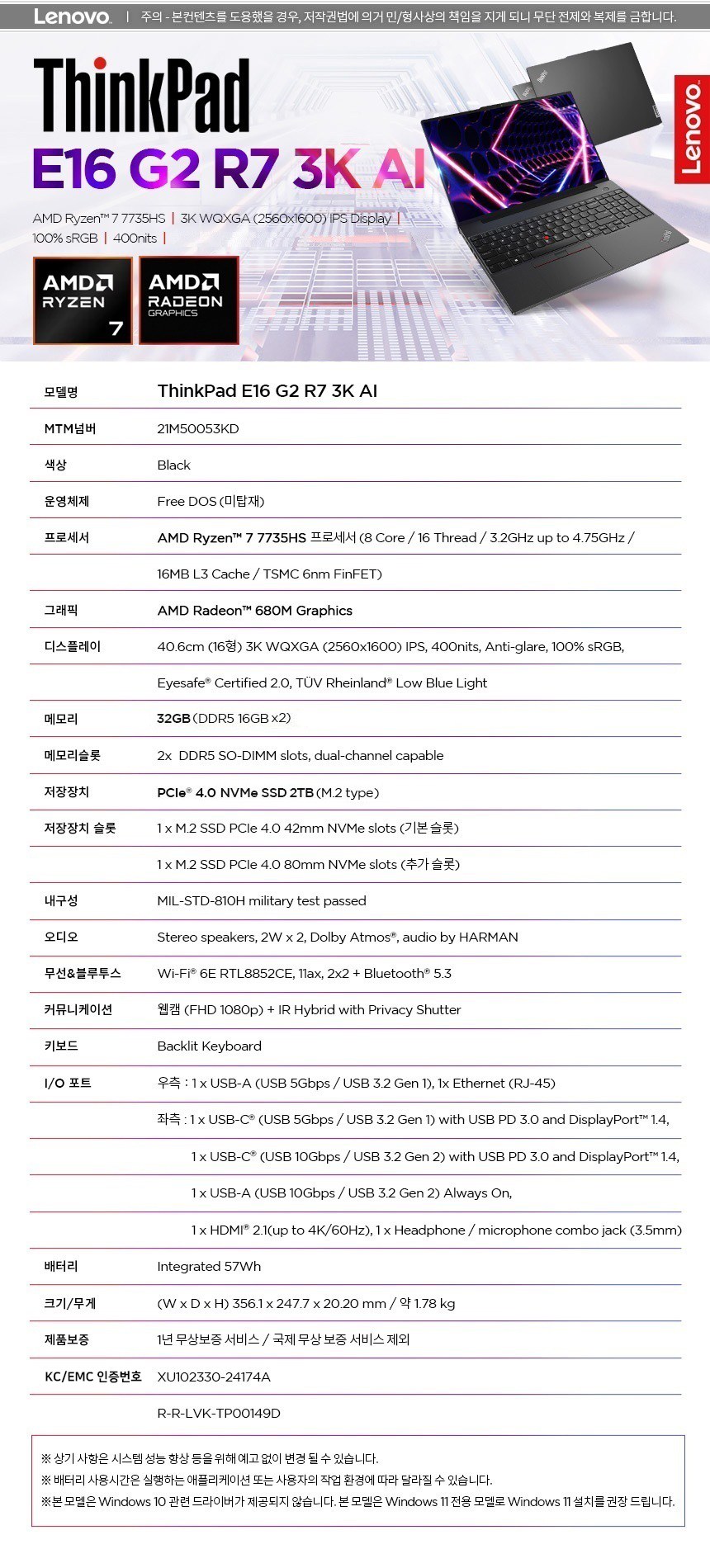| 품명 및 모델명 | 노트북 / Thinkpad E16 G2 R7 3K AI (ThinkPad E16 gen 2) | KC 인증정보 | XU102330-24174A, R-R-LVK-TP00149D |