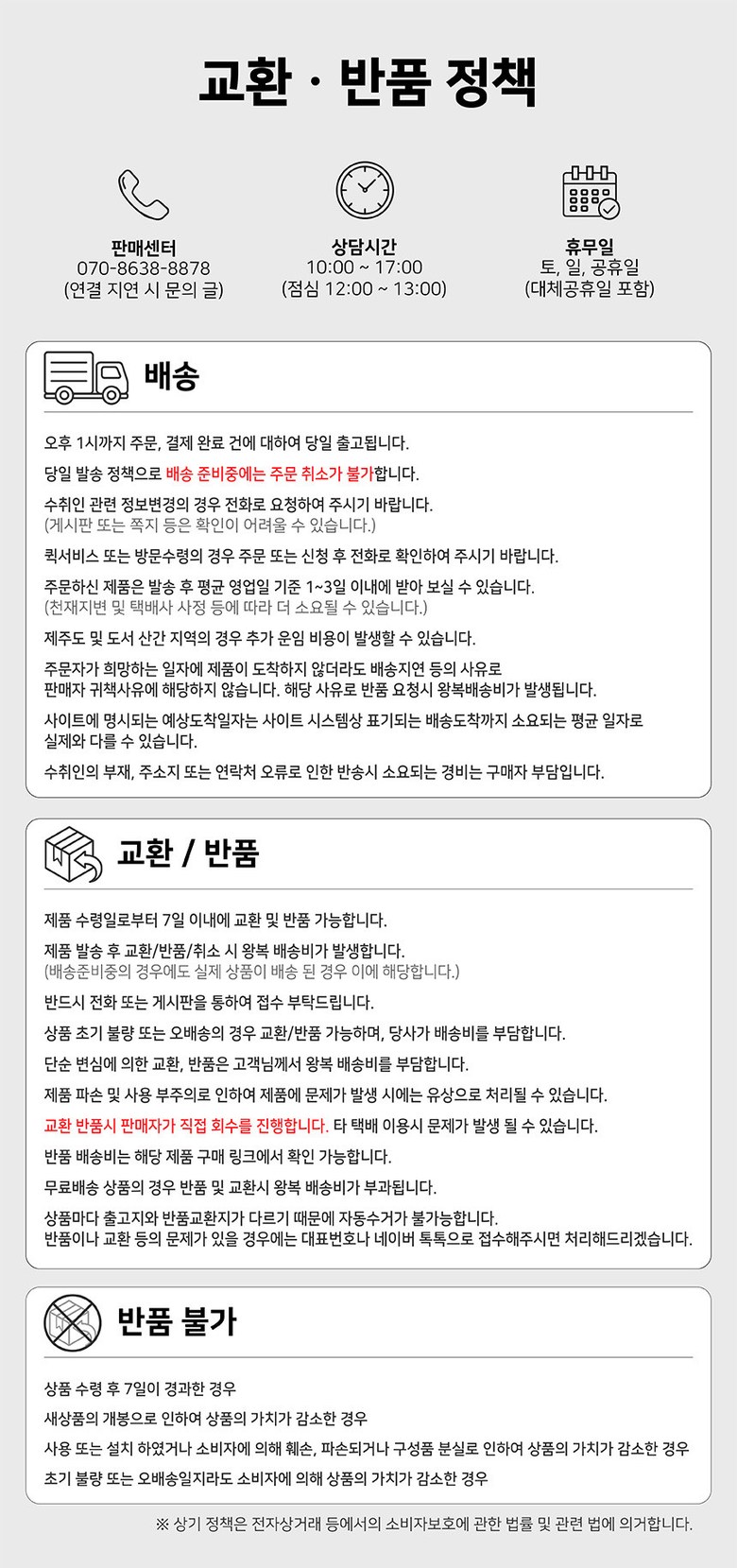 - ㆍ교환/반품에 관한 일반적인 사항은 판매자가 제시사항보다 관계법령이 우선합니다.