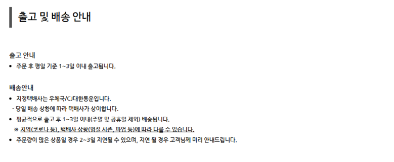 | 배송기간 | ㆍ도서산간 지역 등은 배송에 3-5일이 더 소요될 수 있습니다. - 천재지변, 물량 수급 변동 등 예외적인 사유 발생 시, 다소 지연될 수 있는 점 양해 부탁드립니다. | ||