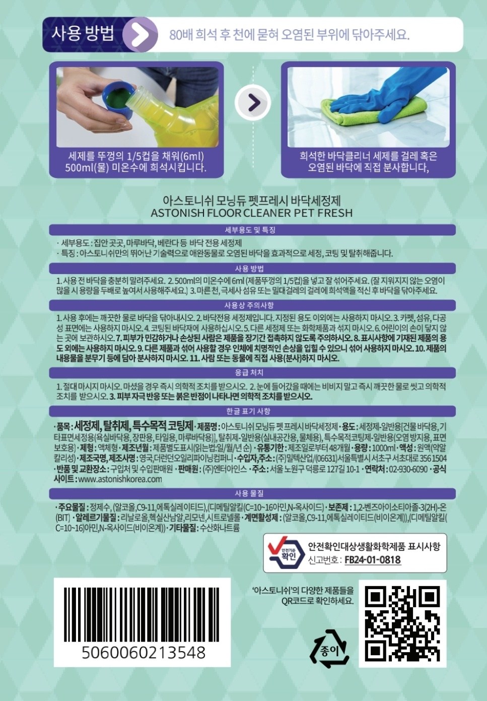 | 품목 및 제품명 | 세정제,탈취제,특수목적코팅제 / 아스토니쉬 모닝듀 펫 프레시 바닥세정제 | 용도(표백제의 경우 계열을 함께표시) 및 제형 | 탈취제 : 일반용 (물체용),일반용 (실내공간용)/세정제 : 일반용 (건물 바닥용),일반용 (기타표면세정용 (욕실바닥용, 장판용, 타일용, 마루바닥용)) / 특수목적코팅제 : 일반용 (오염 방지용),일반용 (표면보호용) / 액체형 |