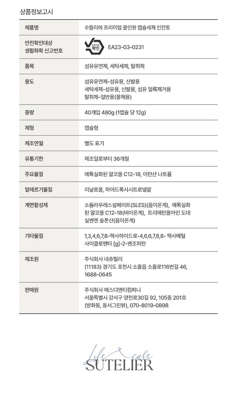 | 품목 및 제품명 | 상품 상세페이지 참조 | 용도(표백제의 경우 계열을 함께표시) 및 제형 | 상품 상세페이지 참조 |