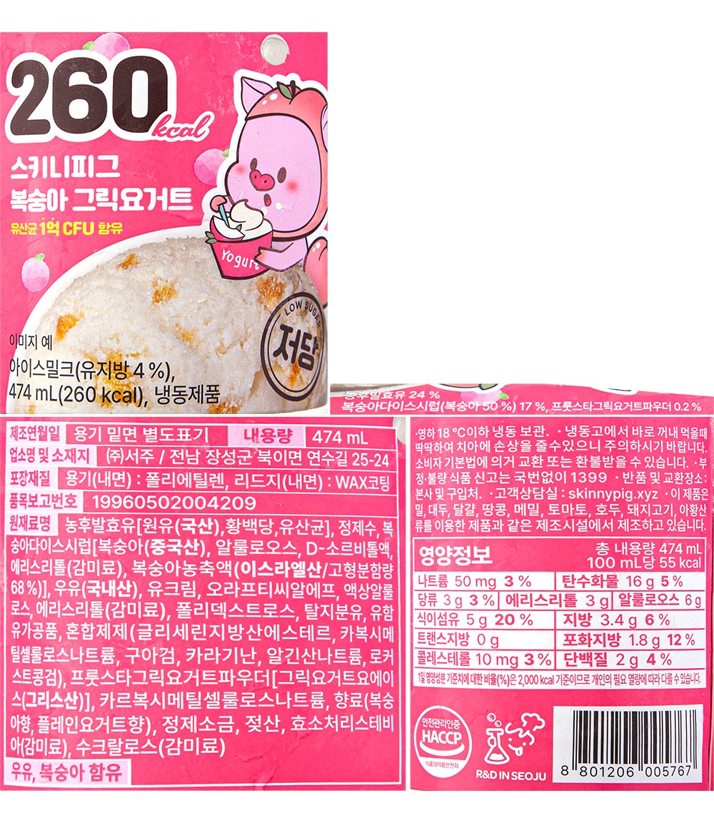 | 제품명 | 스키니피그 복숭아 그릭요거트 | 식품의 유형 | 아이스밀크 |