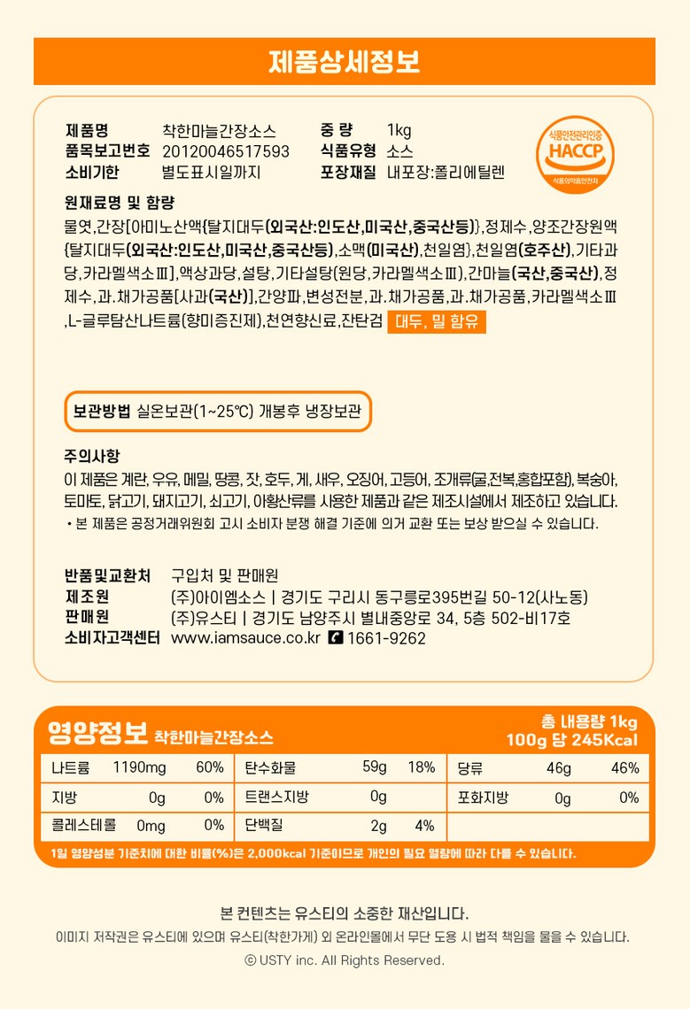 | 제품명 | 착한마늘간장소스 | 식품의 유형 | 소스 |