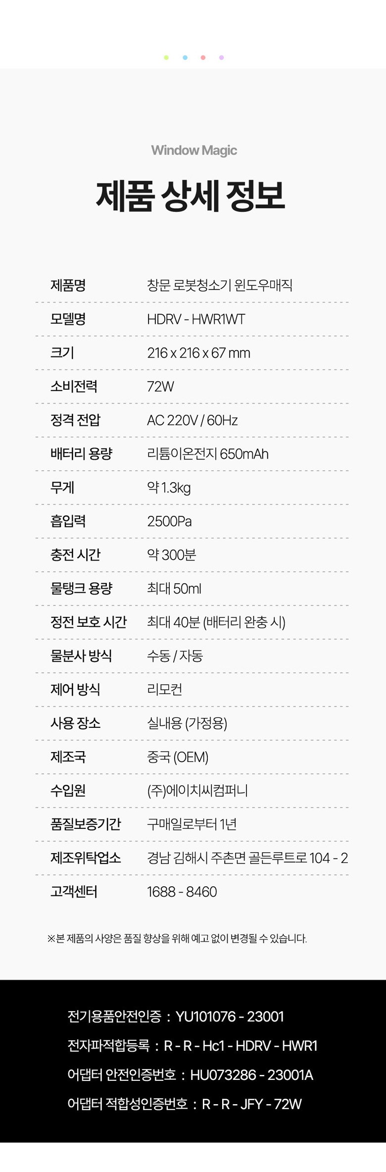 | 품명 및 모델명 | 창문 로봇청소기 / HDRV-HWR1WT | KC 인증정보 | 본품: 유/KC마크, R-R-Hc1-HDRV-HWR1, 전지: YU101076-23001, 어댑터: HU073286-23001A, R-R-JFY-72W |