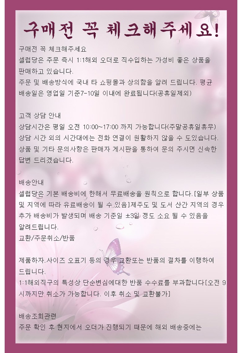 - ㆍ모니터 해상도의 차이로 인해 색상이나 이미지가 실제와 달라, 고객이 단순 변심으로 교환/반품을 무료로 요청하는 경우