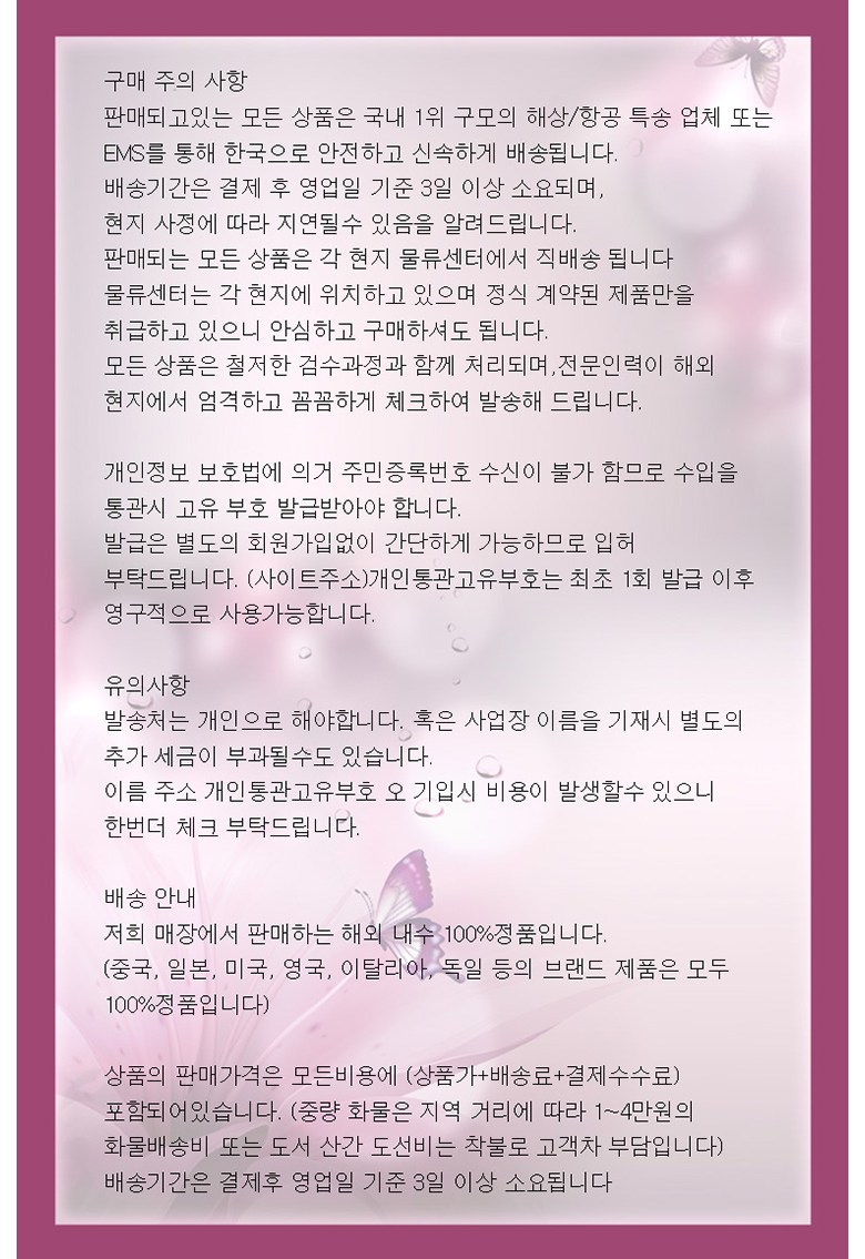 | 배송방법 | 순차배송 | 배송비 | 무료배송 · 도서산간 추가 배송비 - 제주 지역: 5,000원 - 도서산간 지역: 5,000원 |
