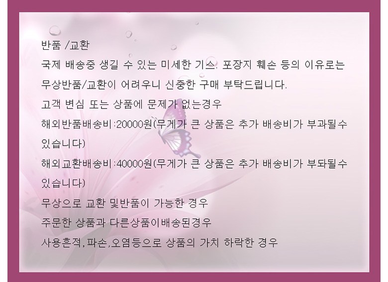| 교환/반품 신청 기준일 | ㆍ단순변심에 의한 교환/반품은 제품 수령 후 7일 이내까지, 교환/반품 제한사항에 해당하지 않는 경우에만 가능 (배송비용과 교환/반품 비용 왕복배송비 고객부담) ㆍ상품의 내용이 표시·광고의 내용과 다른 경우에는 상품을 수령한 날부터 3개월 이내, 그 사실을 안 날 또는 알 수 있었던 날부터 |