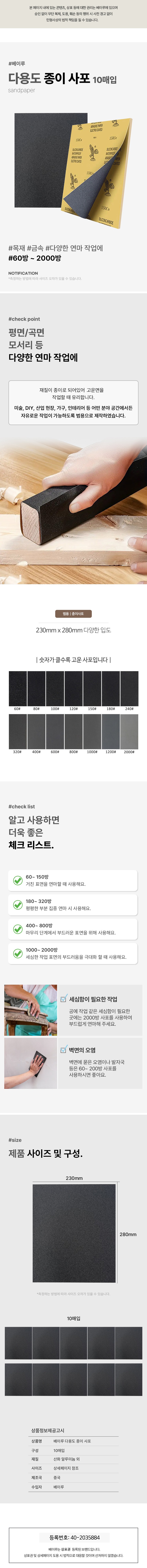 | 품명 및 모델명 | 베이루 다용도 종이 사포 | 인증/허가 사항 | 해당없음 |