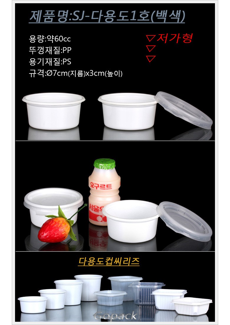 | 품명 및 모델명 | 일회용 소스용기 SJ-1호 백색 3000, 소량 400 | 재질 | PS,PP |