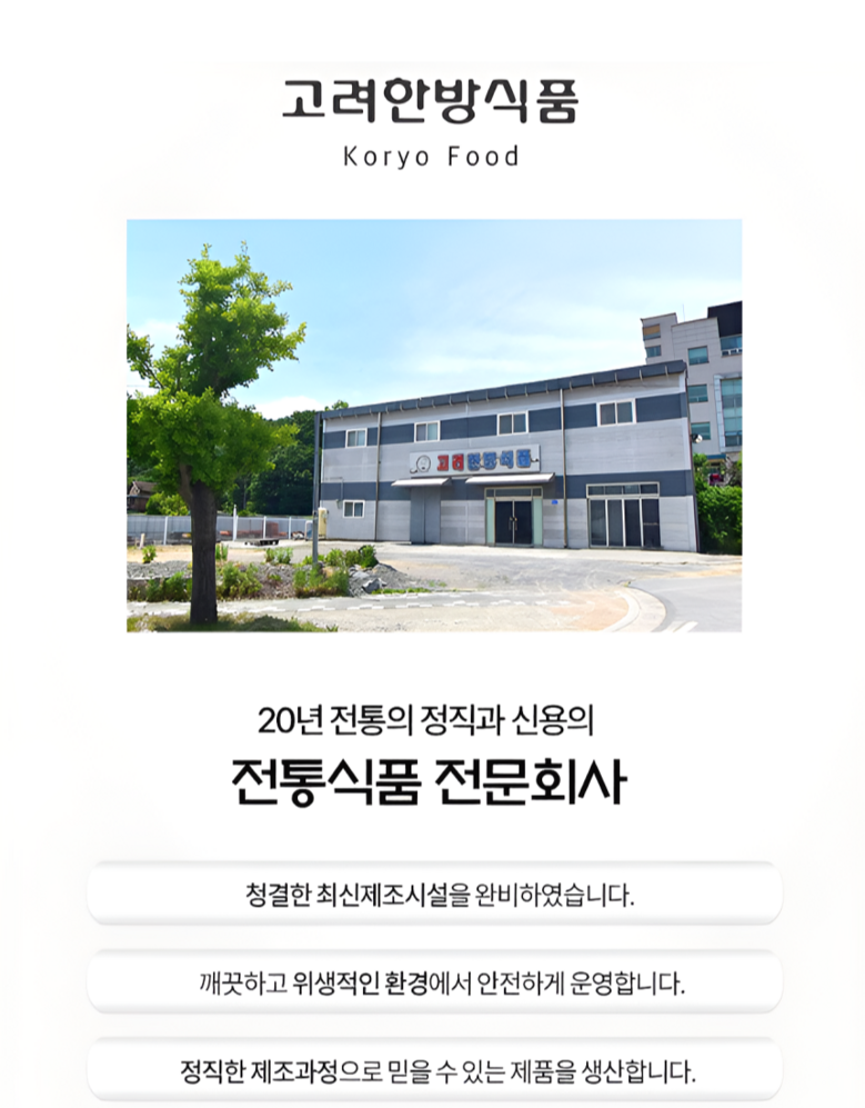 상호/대표자 | 고려한방식품 / 이덕재 | 사업장 소재지 | 충청북도 제천시 봉양읍 장평로 91-1 고려한방식품 |