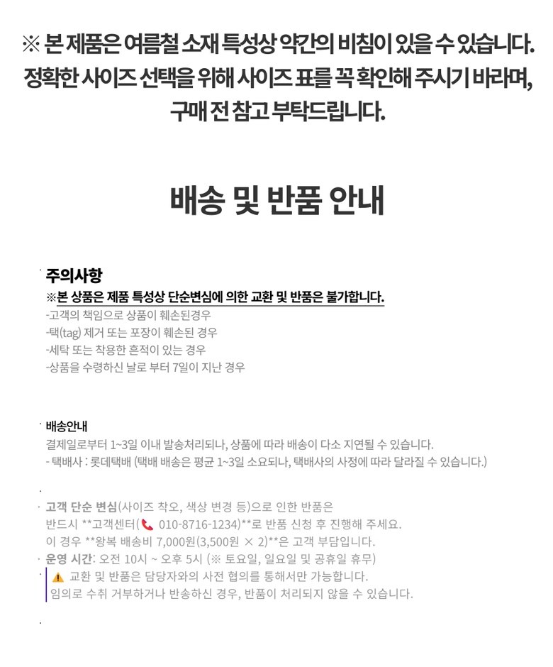 - ㆍ모니터 해상도의 차이로 인해 색상이나 이미지가 실제와 달라, 고객이 단순 변심으로 교환/반품을 무료로 요청하는 경우
