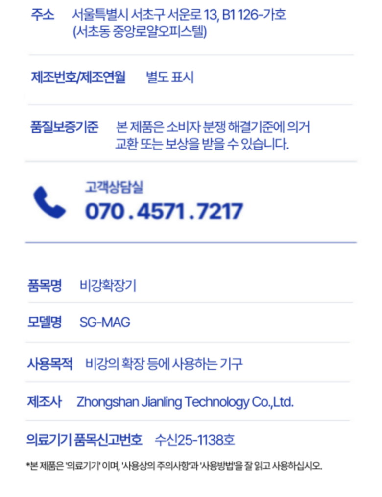 | 품명 및 모델명 | 상품 상세페이지 참조 | 허가∙인증∙신고번호 (의료기기법에 따른 허가∙인증∙신고 대상 의료기기에 한함) | 상품 상세페이지 참조 |