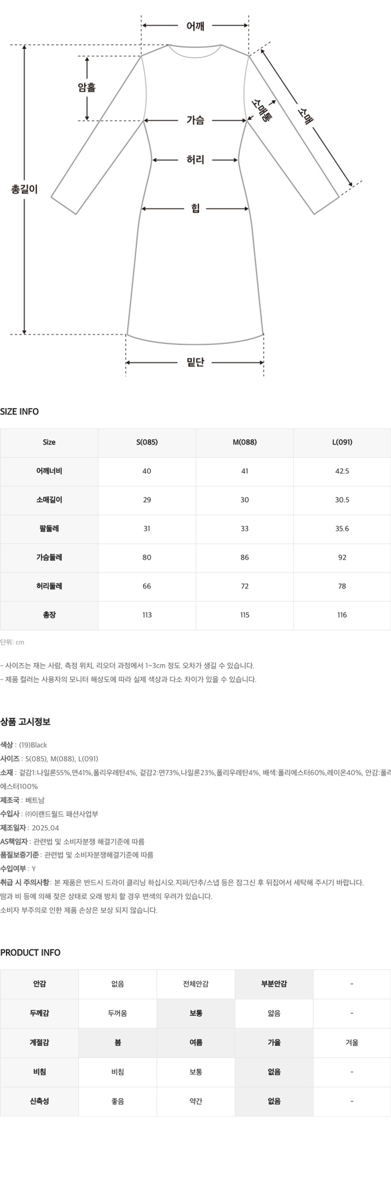 | 치수 | 컨텐츠 참조 | 제조자(수입자) | ELAND VIET NAM CORP LTD / (주) 이랜드월드 패션사업부 |